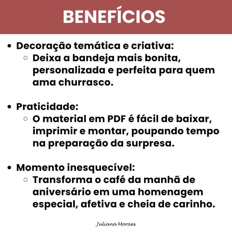 Celebre de um jeito criativo e cheio de personalidade com o Kit Café da Manhã – Aniversário Churrasco! Esse recurso em PDF foi pensado para transformar uma simples bandeja de café da manhã em uma surpresa temática, divertida e inesquecível para o marido, filho ou qualquer parente apaixonado por churrasco. Com elementos decorativos encantadores e prontos para imprimir, o kit ajuda a montar uma homenagem especial com praticidade, deixando o momento ainda mais afetuoso, bonito e marcante. Ideal para quem deseja demonstrar carinho nos detalhes e criar uma comemoração original logo nas primeiras horas do dia.